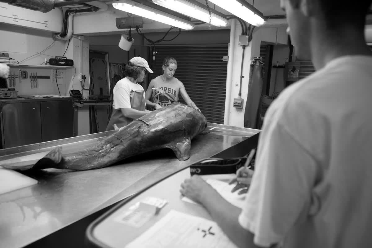 Stranded cetaceans (whales and dolphins) and sea turtles are recovered and transported to Mote. Most calls are for deceased animals. In those cases, SIP staff performs detailed post-mortem examinations known as necropsies (animal autopsies). The information gathered during necropsy helps to evaluate the long-term mortality trends of these species, especially as it relates to pathology or human-related activities. Such research data are crucial to species management and conservation.