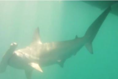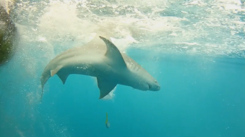 First underwater camera and deployment device to be integrated with an EM system to identify the species of large sharks released while underwater near a vessel. The system also provided valuable footage for documenting shark sex, size range, and short-term post-release fate. (Below Left and Middle: sandbar shark; Right: Great hammerhead shark).