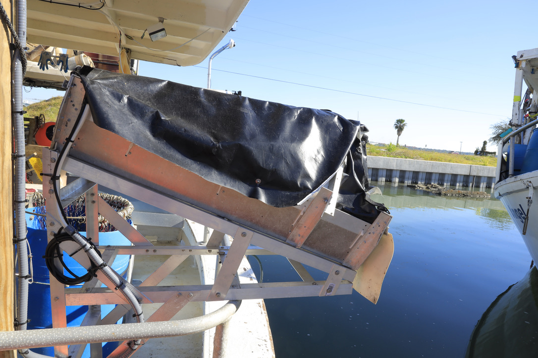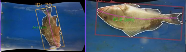 First discard chute installed on a Gulf commercial reef fish fishing vessel in partnership with the NOAA Alaska Fishery Science Center. The chute captured video of undersized red grouper as they passed through; while an automated software algorithm developed by the University of Washington generated individual fish measurements. (Below Left: mounted discard chute; Middle to Right: algorithm obtaining measurements of red grouper discards as they pass through the chute)