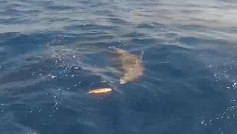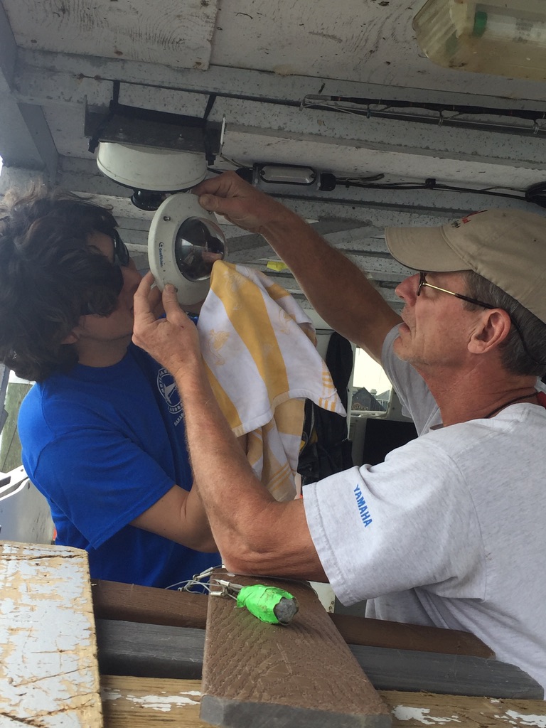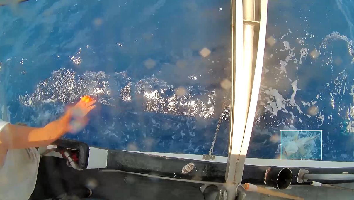 First roof boom-mounted stern cameras installed on bottom longline vessels to document short-term survival of discarded fish behind vessels. This view was used to record whether the fish swam down, floated away, or became prey for predators. (Below Left: roof boom-mounted stern camera; Right: discarded red grouper and bottlenose dolphin interaction)