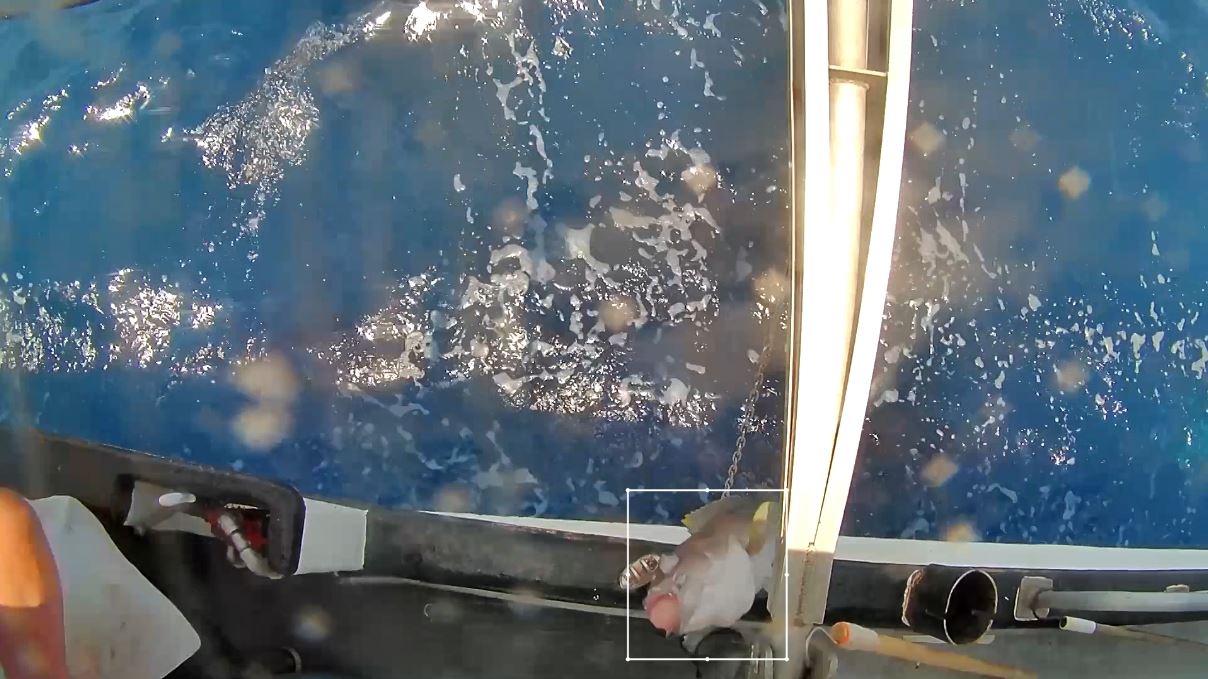A key innovation in our work is the use of artificial intelligence (AI). Over 40 hours of electronic monitoring footage containing thousands of captured species images were shared with CVision AI, Boston, MA to in develop cutting-edge artificial intelligence (AI) catch detection and classification algorithms. These AI tools are designed to accurately identify catch events, suggest the most likely species caught, and significantly reduce video review time and enhance overall efficiency. (Below: example of an AI algorithm tracking [note the box] a yellowedge grouper as it is hauled onboard a bottom longline vessel)