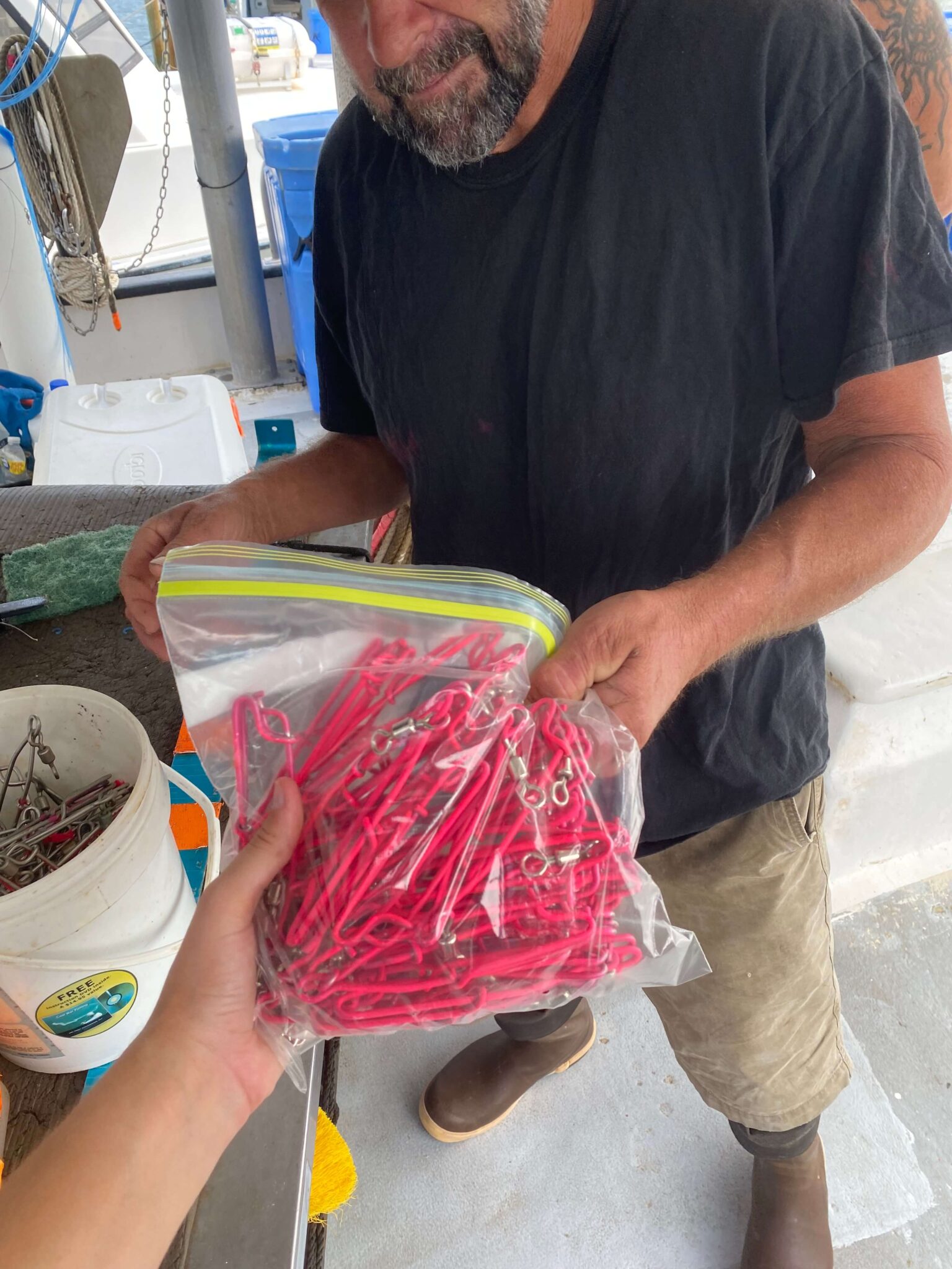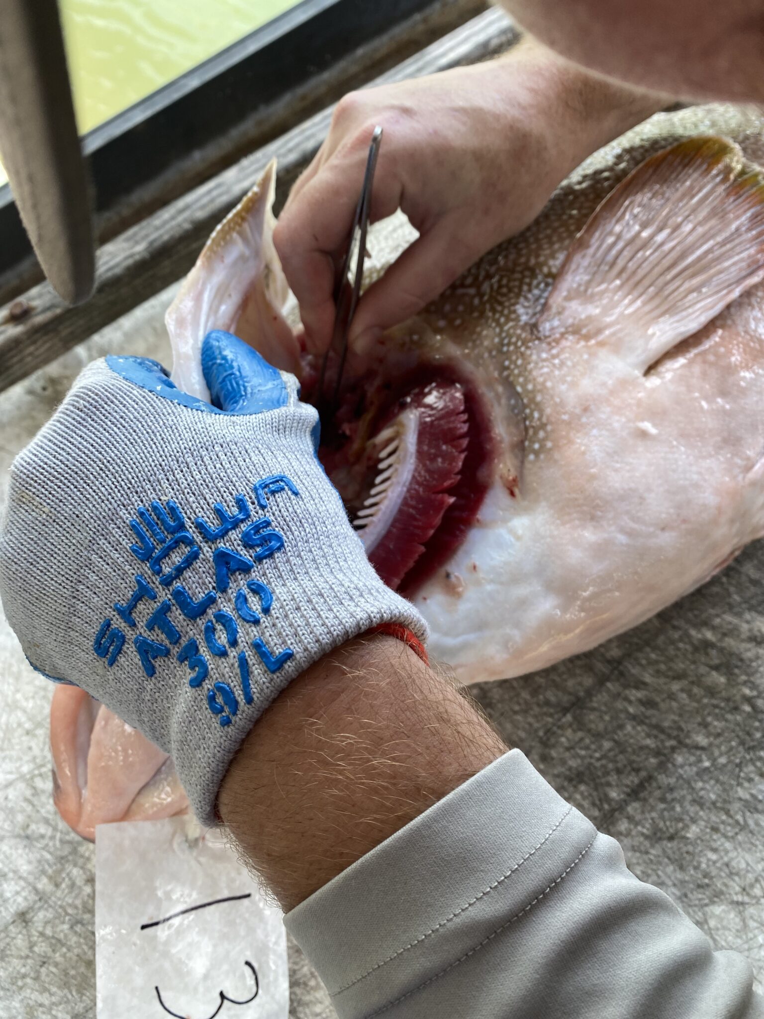 Collaborations with fish house managers will evaluate the market potential of selling fish that were previously discarded. This innovative approach offers benefits for both industry and fisheries management by reducing discard mortality rates and potentially creating new revenue opportunities for industry through the sale of fish that would otherwise go to waste. (Below Photo: undersized red grouper tagged at capture by the fishermen to link individual fish with their EM capture data)