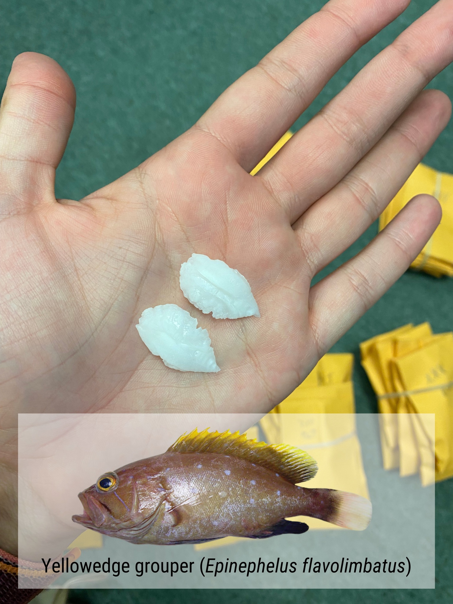To fill critical data gaps, a partnership with commercial reef fish fishermen resulted in the collection and marking of 262 individual fish from 24 data-poor species. CFEMM staff then obtained length measurements and extracted otoliths ‘ear bones’ and fin clips. The biological samples were provided to NOAA Southeast Fisheries Science Center, Panama City, FL and Texas A&M University, Corpus Christi for age determination and genetic profiling. Importantly, each fish was linked with its respective capture location through EM documentation. Involvement of fishermen’s’ contributions directly supports efforts to better understand these species’ populations and characteristics. (Video and photos: collecting otoliths “ear bones,” from different reef fish species; example of otoliths collected from a wenchman snapper and a yellowedge grouper)