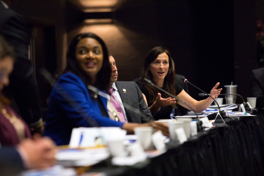 Left: Mote President & CEO Dr. Michael P. Crosby addresses Florida legislators at the Feb. 26 BALD meeting. Middle: Florida Sens. Joe Gruters and Jeff Brandes, and Florida Senate President Bill Galvano. Right: State Rep. Margaret Good discusses harmful algae with event speakers. Credit all: Conor Goulding/Mote Marine Laboratory