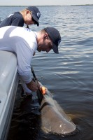 Mote scientists fix an accelerometer tag to the fin of a blacktip shark before the shark is released by a recreational fisherman. The tag records approximately 100 data points per second to monitor every move that the shark makes for one to two days after release, and then it detaches from the shark and floats to the surface to be recovered by researchers.