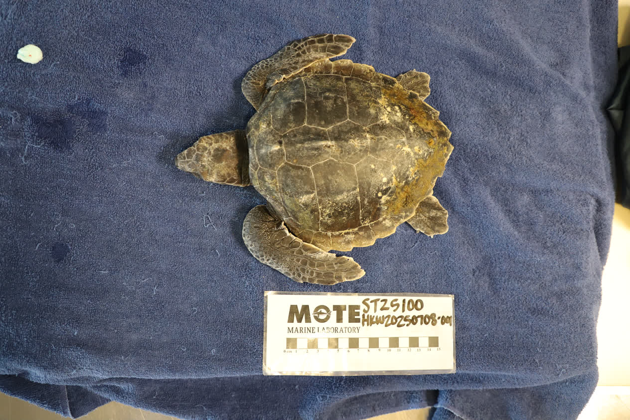 07/08/2025 This turtle was found floating upside down in the surf line. It was transferred to Mote staff by Coastal Wildlife Club. It was reported that there was fishing line on the left front flipper at the time of stranding.
